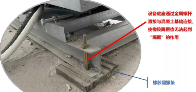 如上圖所示,設(shè)備底座通過(guò)金屬螺桿穿過(guò)直接與混凝土基礎(chǔ)、或金屬框架連接固定,那設(shè)備運(yùn)行的振動(dòng)可通過(guò)金屬螺桿這個(gè)“硬連接”傳導(dǎo)至建筑結(jié)構(gòu),隔離在設(shè)備與建筑結(jié)構(gòu)之間的橡膠減振墊如同“虛設(shè)”,發(fā)揮不了減振的作用。