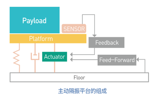 被動隔振平臺在低頻段難以隔離振動,為改善其隔振性能,主動隔振平臺安裝振動傳感器和執(zhí)行器,以此有效控制振動。主動隔振系統(tǒng)從隔振臺上板處開始測試振動,由控制執(zhí)行器推力的反饋控制,以及從隔振臺地板處開始測試振動并以此來控制執(zhí)行器推力的前饋控制組成。