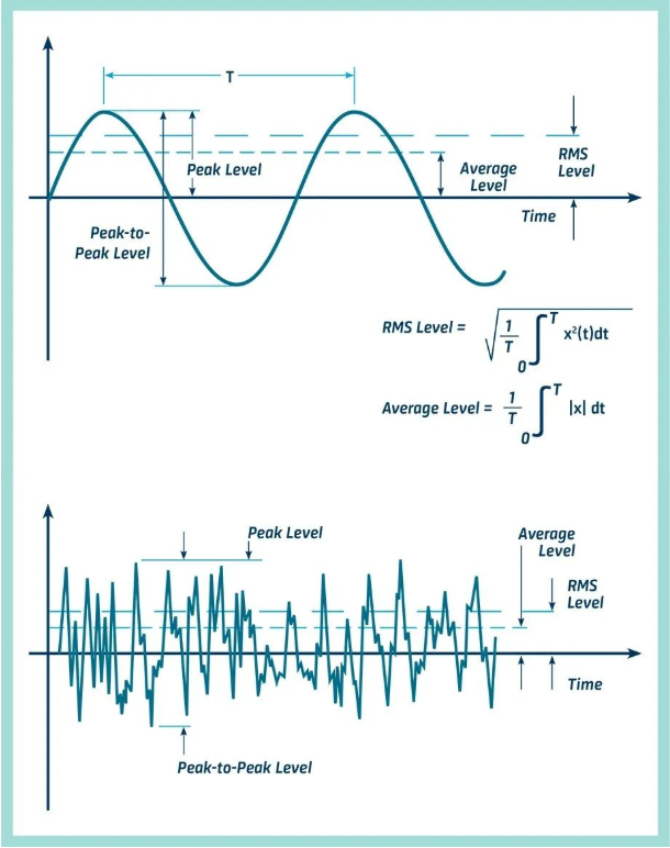 振動幅度是描述振動嚴重程度的特征,可以以幾種方式量化。圖中顯示了正弦波的峰峰值、峰值、平均值和RMS值之間的關系。