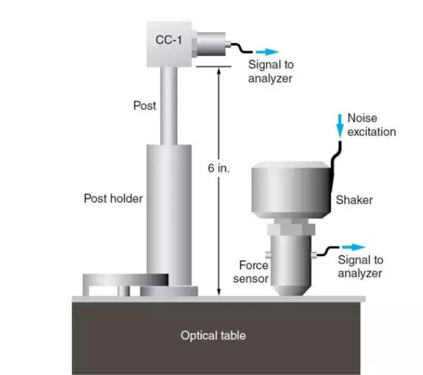 光學元件的形變是系統(tǒng)不穩(wěn)定的第二大來源。即使將光學平臺視作剛體,該剛體的固有振動依然會觸發(fā)光學調整架的自然振動,導致光路不穩(wěn)定。為了定量模擬光學調整架在典型實驗室環(huán)境中可能產(chǎn)生的位移,我們將1英寸調整架固定于6英寸鏡柱上,并在光學平臺表面模擬類似于桌面上的風扇、電動位移臺或其他聲學擾動的寬帶噪聲。調整架的位移由一個不產(chǎn)生任何質量效應的激光測振儀來測量。實驗使用了主動阻尼光學平臺,同時測量結構阻尼和主動阻尼的運動,以便充分地體現(xiàn)阻尼桌面的減振效果。