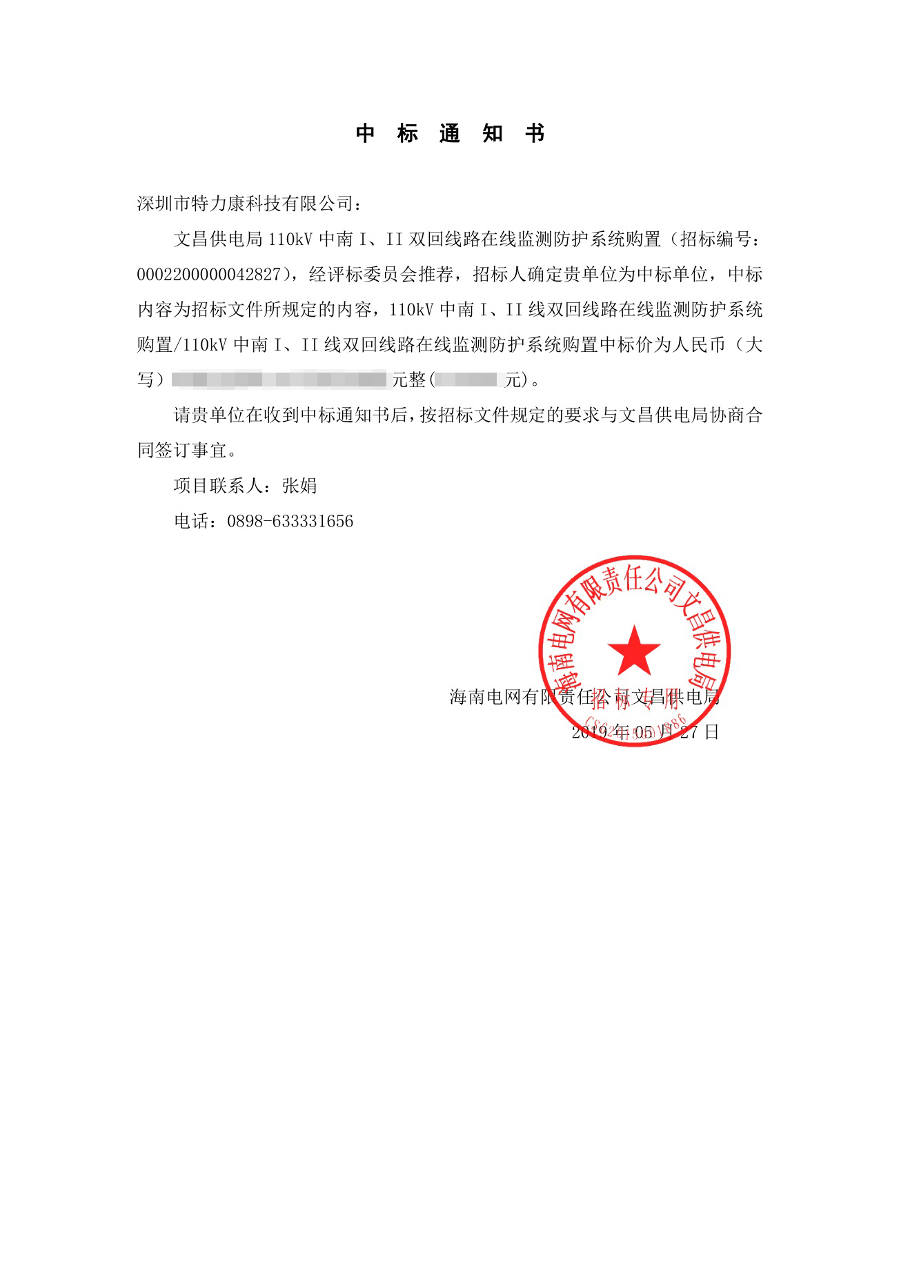 經(jīng)評標(biāo)委員會推薦,文昌招標(biāo)單位,確定我司(深圳市特力康科技有限公司)為文昌供電局雙回線在線監(jiān)測防護(hù)系統(tǒng)項目中標(biāo)單位,現(xiàn)將中標(biāo)公告公示。