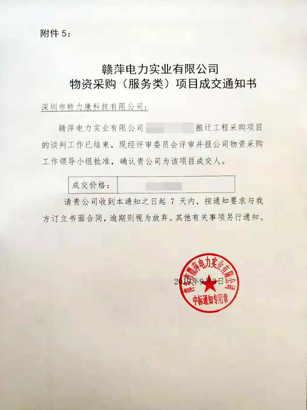 贛萍電力220KV線路搬遷工程采購項(xiàng)目談判工作已結(jié)束,經(jīng)招標(biāo)評(píng)審委員會(huì)評(píng)審,現(xiàn)確定我司以此次線路搬遷工程中標(biāo)單位。