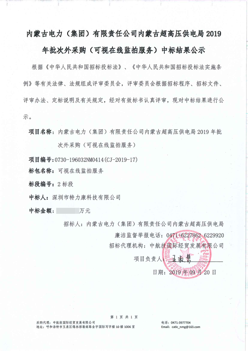 經審委員會根據(jù)招標程標次評審、定標說明及有關規(guī)定,經對有效標書認真評審,確定我司為內蒙古電力(集團)有限責任公司內蒙古超高壓供電局2019年批次外采購(可視在線監(jiān)測服務)項目中標單位。