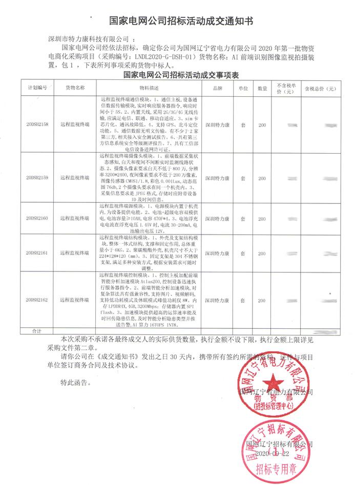 國家電網(wǎng)公司經(jīng)依法招標(biāo),確定我司(深圳市特力康科技有限公司)為國網(wǎng)遼寧省電力有限公司2020年第一批物資電商化采購項(xiàng)目(采購編號(hào): LNDL2020-G- -DSH-01)貨物名稱: AI 前端識(shí)別圖像監(jiān)視拍攝裝置,包1,下表所列事項(xiàng)采購貨物中標(biāo)人(附件如下)。