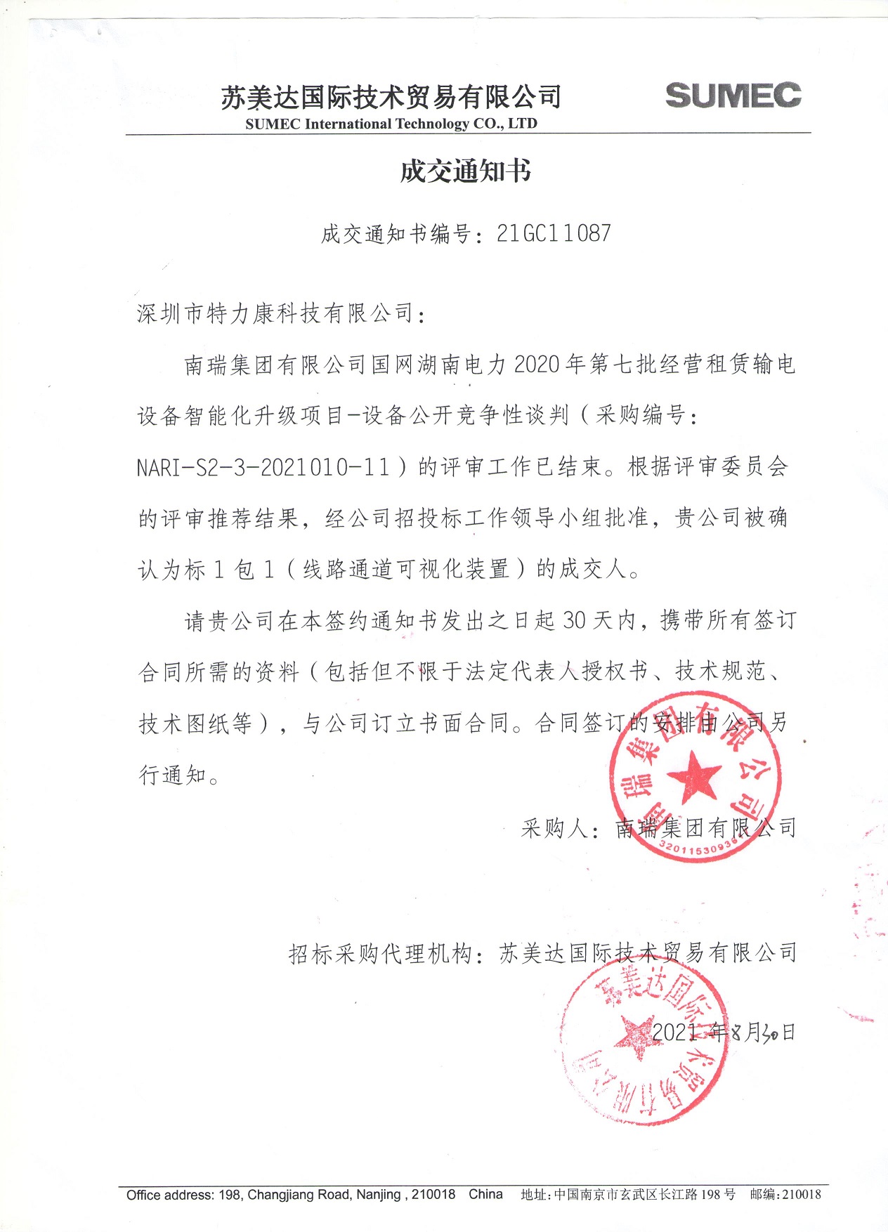 南瑞集團有限公司國網(wǎng)湖南電力2020年第七批經(jīng)營租賃輸電設(shè)備智能化升級項目-設(shè)備公開競爭性談判(采購編號:NARI-S2-3-2021010-11 )的評審工作已結(jié)束。根據(jù)評審委員會的評審?fù)扑]結(jié)果,經(jīng)公司招投標工作領(lǐng)導(dǎo)小組批準,我司被確認為標1包1 (線路通道可視化裝置)的成交人。中標公告如下: