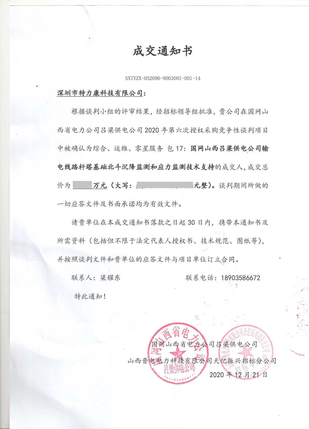 根據(jù)談判小組的評審結果,經(jīng)招標領導組批準,貴公司在國網(wǎng)山西省電力公司呂梁供電公司2020年第六次授權采購競爭性談判項目中被確認為綜合、運維、零星服務包17:國網(wǎng)山西呂梁供電公司輸電線路桿塔基礎北斗沉降監(jiān)測和應力監(jiān)測技術支持的成交人,成交通知如下: