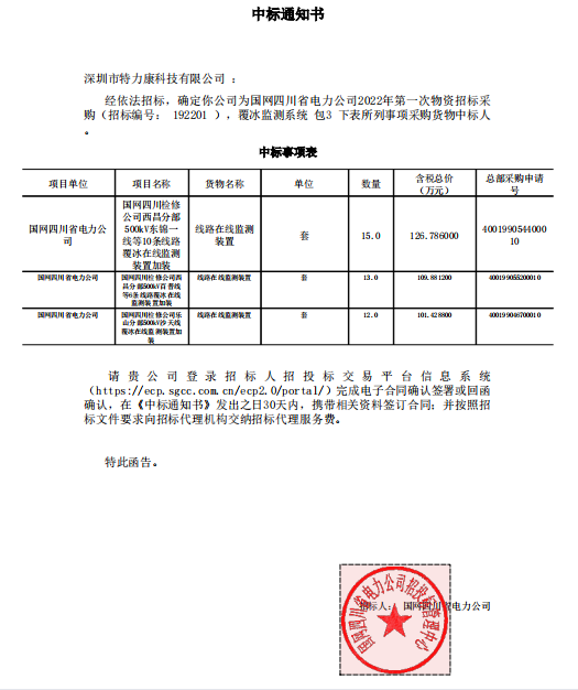 深圳市特力康科技有限公司:經(jīng)依法招標,確定你公司為國網(wǎng)四川省電力公司2022年第一次物資招標采購(招標編號: 192201 ),覆冰監(jiān)測系統(tǒng)包3下表所列事項采購貨物中標人,中標通知如下: