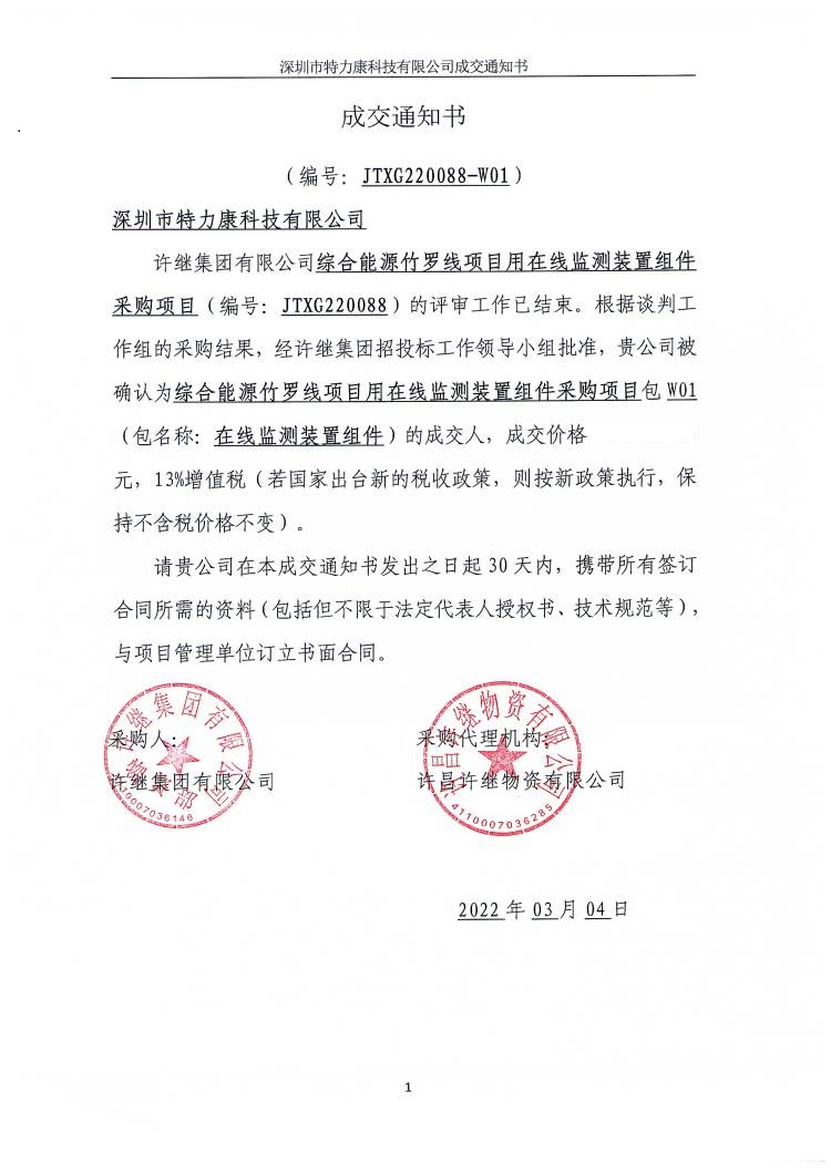 許繼集團(tuán)有限公司綜合能源竹羅線項(xiàng)目用在線監(jiān)測(cè)裝置組件采購項(xiàng)且(編號(hào): JTX6220088)的評(píng)審工作已結(jié)束。根據(jù)談判工作組的采購結(jié)果,經(jīng)許繼集團(tuán)招投標(biāo)工作領(lǐng)導(dǎo)小組批準(zhǔn),貴公司被確認(rèn)為綜合能源竹羅線項(xiàng)且用在線監(jiān)測(cè)裝置組件采購項(xiàng)目包W01(包名稱:在線監(jiān)測(cè)裝置組件)的成交人,成交通知如下: