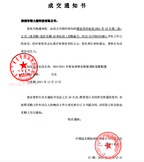 特力康中標(biāo)國網(wǎng)黑龍江送變電工程公司的2024年度第18次物資類競爭性談判采購項(xiàng)目——慶陽驅(qū)鳥器物資框 特力康中標(biāo)國網(wǎng)甘肅省電力公司省管產(chǎn)業(yè)單位2024年第五次物資競爭性談判授權(quán)采購項(xiàng)目 中標(biāo)喜訊:深圳市特力康科技有限公司成功入圍許繼集團(tuán)綜合能源公司輸電線路視頻在線監(jiān)測裝置模塊集采項(xiàng)目 中標(biāo)喜訊:特力康成功中標(biāo)國網(wǎng)重慶市電力公司渝中一片區(qū)項(xiàng)目 特力康成功中標(biāo)國網(wǎng)天津市電力公司2024年第二次?物?資招標(biāo)項(xiàng)目 特力康中標(biāo)國網(wǎng)安徽省電力有限公司蕪湖供電公司2024年3月非物質(zhì)采購項(xiàng)目 內(nèi)蒙電網(wǎng)裝上 “舞動監(jiān)測眼”:特力康輸電線路防舞動監(jiān)測系統(tǒng)守護(hù)線路安全 浙江電力裝上“氣象哨兵”:特力康裝置守護(hù)電網(wǎng)應(yīng)對臺風(fēng)暴雨 蜀道巡線不用“爬”:特力康視頻在線監(jiān)測裝置守護(hù)四川輸電鐵塔 風(fēng)雪中的 “防冰哨兵”:內(nèi)蒙古電力用特力康監(jiān)測系統(tǒng)筑牢覆冰防線 雙軸感知護(hù)塔穩(wěn):山西電力用特力康裝置破解采空區(qū)傾斜難題 江西電力裝上 “智能防鳥衛(wèi)士”—— 特力康綜合激光驅(qū)鳥器破解湖區(qū)變電站鳥害難題 破解巡檢難題:貴州電力用特力康 AI 微拍裝置,精準(zhǔn)捕捉線路隱性隱患 精準(zhǔn)捕捉 “微氣象”:浙江電力用特力康預(yù)警系統(tǒng)筑牢電網(wǎng)氣候防線 守護(hù) “電力咽喉”:湖南電力投用百套特力康三跨 4G 監(jiān)控球,筑牢安全防線 貴州電力裝特力康電網(wǎng)架空線路覆冰監(jiān)測系統(tǒng),精準(zhǔn)防冰保電網(wǎng)過冬? 寧夏配電線路安裝了我司防外破電子化智能警示牌
