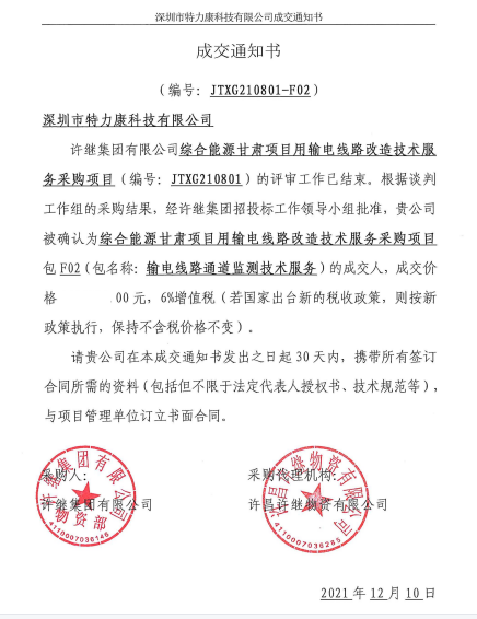 許繼集團(tuán)有限公司綜合能源甘肅項(xiàng)目用輸電線路改造技術(shù)服務(wù)采購項(xiàng)且(編號(hào): JTXG210801) 的評(píng)審工作已結(jié)束。根據(jù)談判工作組的采購結(jié)果,經(jīng)許北集團(tuán)招投標(biāo)工作領(lǐng)導(dǎo)小組批準(zhǔn)。我司被確認(rèn)為綜合能源甘肅項(xiàng)目用輸電線路改造技術(shù)服務(wù)采購項(xiàng)目包F02(包名稱:輸電線路通道監(jiān)測(cè)技術(shù)服務(wù))的成交人,成交通知如下: