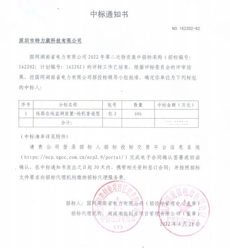 國網(wǎng)湖南省電力有限公司2022年第二次物資集中招標(biāo)采購(招標(biāo)編號:162202;計(jì)劃編號: 162202) 的評標(biāo)工作已結(jié)束,根據(jù)評標(biāo)委員金的評審結(jié)果。經(jīng)國網(wǎng)湖南省電力有限公司招投標(biāo)領(lǐng)導(dǎo)小組批準(zhǔn)。確定我單位為下列標(biāo)包(線路在線監(jiān)測裝置- 槍機(jī)普通型)中標(biāo)人,中標(biāo)通知如下:
