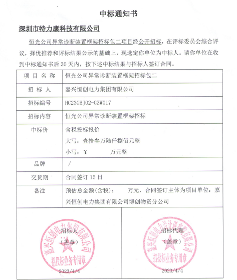 恒光公司異常診斷裝置框架招標包二項目經(jīng)公開招標,在評標委員會綜合評議,擇優(yōu)推薦和評標結(jié)果公示的基礎(chǔ)上,現(xiàn)選定我司為中標人,中標通知如下: